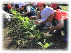 秋野菜の間引きをしました。雨が続いたため、なかなか畑に出られず、間引きもできずにいました。晴れ間を見て、やっと畑の野菜に会えたので、みんな「大きくなっている!」「葉っぱの数も増えているよ!」と大喜びでした。全員が大根の間引きをして、その後その他の葉物野菜の間引きに挑戦しました。たくさん穫れた子もいれば、慎重に抜いていたために少ない子もいましたが、どの子も目を輝かせて活動していました。翌日、子どもたちに聞くと、「お味噌汁にしてもらったよ」「やわらかくて、おいしかったよ」とうれしい報告をしてくれました。
