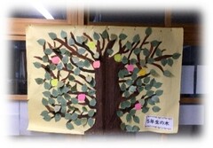 元気にあいさつをした子どもたちには、あいさつの木に貼れる木の葉と実が渡され、5年生の木はたくさんの葉と実で彩られました。