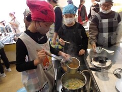 自分たちで作った材料で調理実習! 正善寺の小林様のもとで、5月に田植えをし9月に稲刈りをしたお米と、7月に丸久味噌の佐藤様と一緒に仕込んだみそが届きました。そこで、みんなで味わおうと、ご飯とみそ汁の調理実習を行いました。 ふっくらもっちり、つやのあるご飯が炊けました。少しできてしまったおこげもおいしかったようです。みそ汁は煮干しで出汁をとり、実を煮て最後にみそを入れました。「すごくおいしい!」「もっと食べたい」という声が上がりました。自分たちの米・みそということで、おいしさ倍増だったようです。