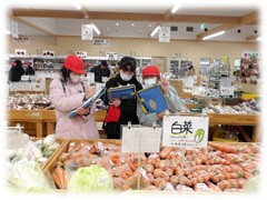 あるるん畑では、メイド・イン上越の認証品や冬の上越野菜について、売り場を見学しました。店員さんやお客さんにインタビューを行い、上越野菜を買いに来るお客さんがたくさんいることや、POP等を使って販売しているあるるん畑の工夫などを知ることできました。