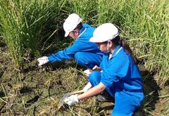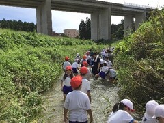 これまで大瀬川での活動を繰り返してきた子どもたち。校区に「正善寺川」があることを知ると、「行ってみたい!」という思いを高め、実際に足を運びました。これまで何度も訪れてきた大瀬川と比べながら、「正善寺川は大瀬川より流れが速い」「生き物が小さいね」など、興味深く観察していました。また、「正善寺川は大瀬川とつながっているのかな?」「正善寺川の水はどこから流れてくるのだろう?」「流れが速いのは、傾きが急だからかな?」など、さまざまな疑問も生まれました。