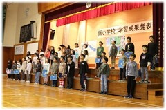 学習成果発表会 頑張りました!子どもたちは、学んだことや成長したことを多くの方に伝えたいと願い、約1か月間、準備を重ねてきました。子どもの感想には、「遠くに座っている人にも聞こえるように伝えることをめあてにして、一か月前からいっぱい練習してきました。ぼくは、司会もしたので、「もっと練習が必要だ」と思いがんばりました。また、「自分のだけおぼえても、友達が休むかもしれない。みんなの分もおぼえよう」とたくさんじゅんびをしました。学習成果発表会で学んだことは、やっぱり練習が大事だということです。あきらめたらなにもできないけれど、いっぱい練習したから上手にできたと思いました。ランチャレも運動会も全部同じでした。これからも、いろいろなことをあきらめず、がんばります。」とありました。学習成果発表会を通して多くのことを学んだようです。
