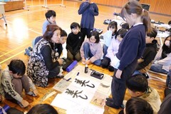 書き初め練習スタート!書家の荒川様から書き初めの指導をしていただきました。筆の運び方を始め、道具の手入れの仕方や硯(すずり)の使い方などの話を子どもたちは集中して聞いていました。「トン・クイッ・スー、トン」の声に合わせて書くことを通して、躍動感のある文字が書けるようになりました。書き初め用紙に三文字しか入らなかった文字がバランスよく四文字書けるようになった子、細かった線が太く力強くなった子、はらいやはねが美しくなった子など、2時間の成果が見られました。
