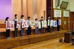 いじめ見逃しゼロスクール集会6年生は、これまで部落差別問題をテーマにした学習を進めてきました。今回は、その学習で学んだことや感じたことなどを中心に各学級で「いじめゼロ宣言」を作成し、発表しました。学習を通して伝えたいことは、堂々と声を張って全校児童に伝えることができました。