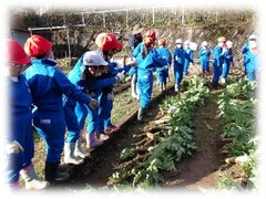 みんなでがんばった 最後の収穫ぽかぽかのよい天気に恵まれた日、ねいろ畑の最後の収穫をしました。まずは、みんなで大根抜きです。「せーの!」「うんとこしょ、どっこいしょ!」と、力いっぱい引っ張りますが、なかなか抜けません。「がんばれ!」「一緒に抜こう」と互いに励まし合い、力を合わせて抜いていました。抜き終わると、畝の上にずらりと大根が並びました。その数、126本!!(とてもとても小さい大根も含みます)