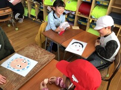 お正月遊びをしました!3時間目には、ALTのブレアと一緒に体のパーツの英語を学習し、学習した英語を使って福笑いをしました。ペアになって、おかめとひょっとこの福笑いに挑戦、目隠しを取ったときの大笑いでクラスがとってもにぎやかになりました。